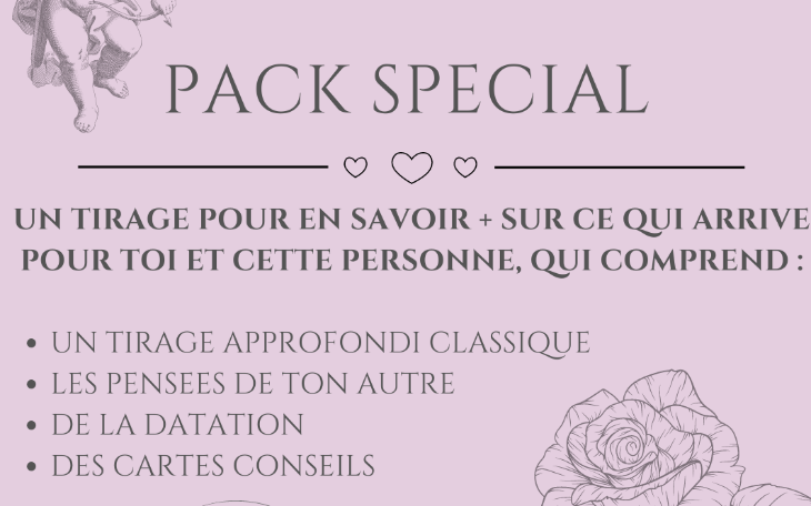 Dans ce tirage un peu spécial, que je vous propose au format de pack qui comprend un tirage approfondi classique, les pensées de votre autre, de la datation ainsi que des cartes conseils, vous apprendrez ce qui vous attend avec cette personne qui vous est chère, les éventuels blocages et avancées, quand cela va se débloquer ou se concrétiser selon votre projet, ce que cette personne pense de vous et enfin des conseils de vos guides afin de mieux appréhender votre relation avec l'élu.e de votre coeur.